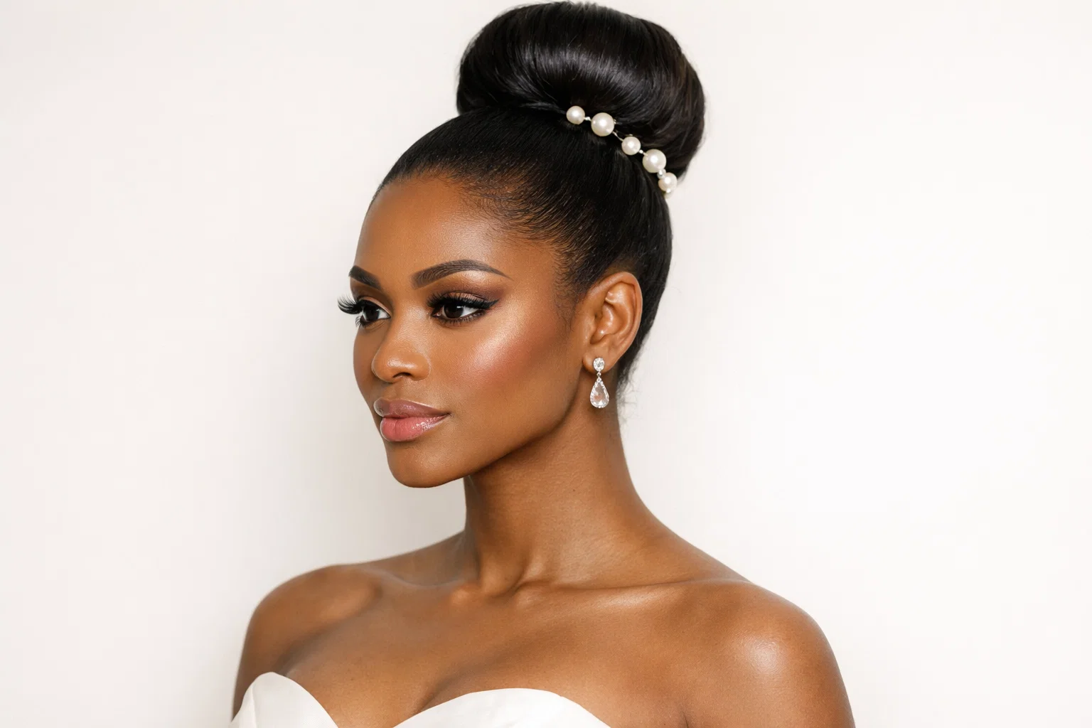 To achieve this look, hair should be blow-dried smooth, gathered at the crown, and secured with a strong elastic band. The bun itself can be wrapped neatly or left slightly textured for dimension. A light-hold spray helps maintain the sleekness throughout the ceremony and reception.